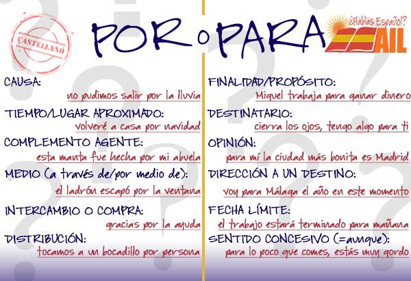 Las preposiciones son enlaces con función subordinante.POR y PARA son una de las que causa mas dudas a la hora de escribir, la gramatica española es muy amplia,pero debemos ir estudiandola poco a poco para lograr una mejor escritura. Cuando hablamos, quizas se hace un poco imperceptible, pero a la hora de escribir es importante el buen uso de la gramatica. En mis clases podemos compartir una sesion completa donde desarrollaremos practicas del uso de por y para. Nos vemos pronto