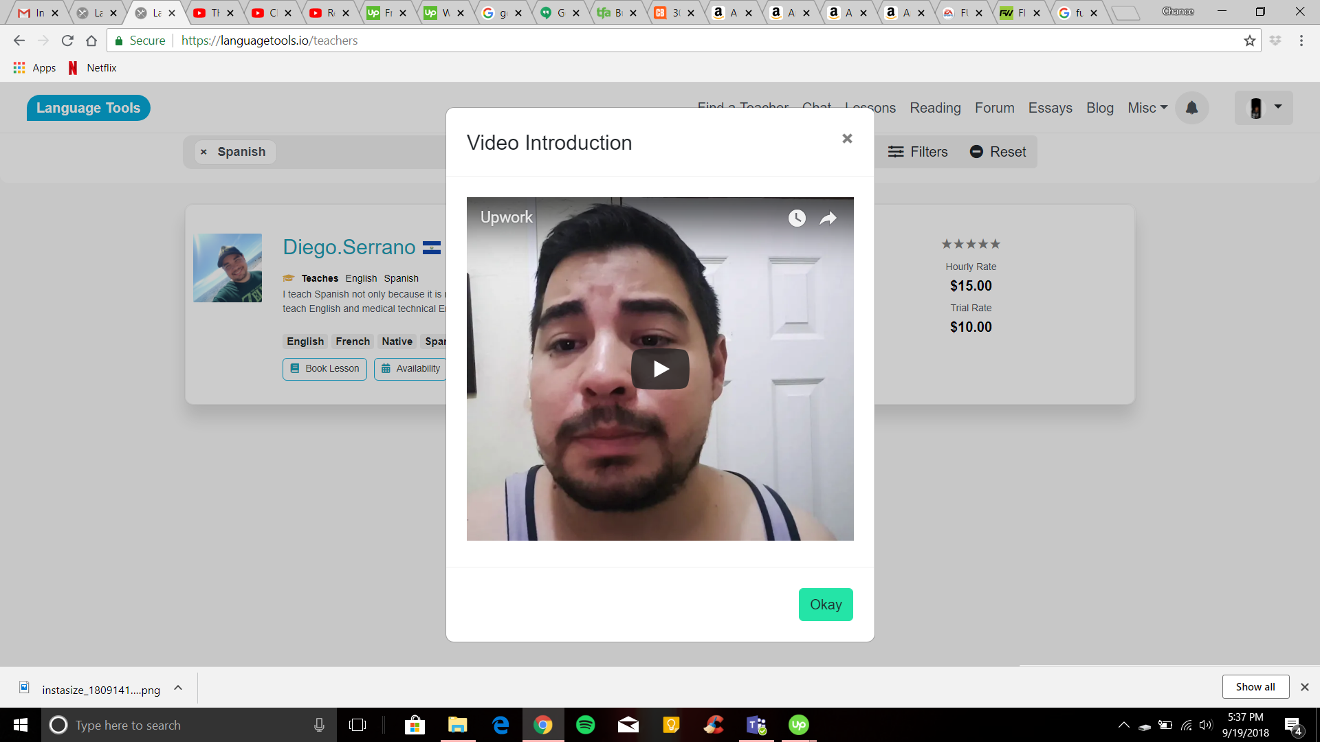 On the pop-up window where you can view a teacher's introduction video, the button to close the window after watching could say 'Close' or 'Finished' instead of 'Okay'