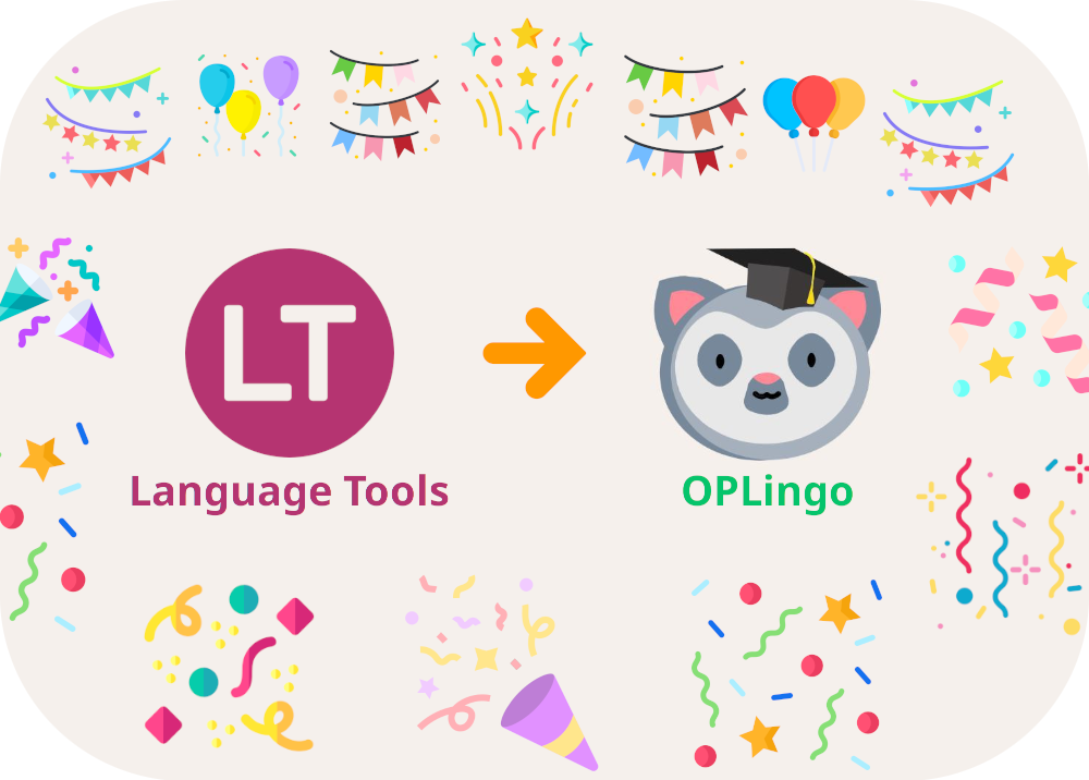 We'd like to say thanks to all those who contributed, by helping us to come up with a new name, by talking about us in their communities, by telling us what they wanted from the platform, by subscribing to LT, and by simply learning languages with us. Tomorrow (or later today, depending on where you are), LanguageTools.io will become OPLingo.com. Don't worry, you will be able to continue as normal, as your accounts, data, and progress will be seamlessly transferred. You won't even have to type the new address, as you'll be automatically redirected to the new website.