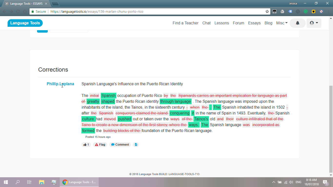 The name if the person is clickable and leads to that person's profile. The name of the person who corrected the essay is not.