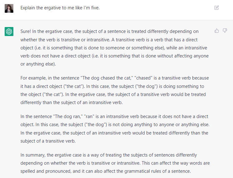 I asked ChatGPT to "explain the ergative case like I'm five". The result was a description of the Ergative in relatively difficult language and without examples that might help understanding. I thought maybe the algorithm didn't understand "explain like I'm five", so I reworded the question as "Explain the ergative case to me in very simple language and with examples". The result was underwhelming: